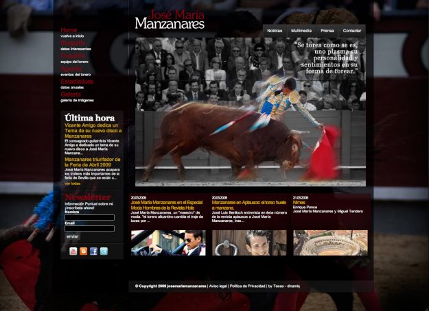 El diestro alicantino José María Manzanares estrena página web bajo el nombre de www.josemariamanzanares.com. Manzanares, que hasta ahora no contaba con ningún espacio oficial en la Red, ha creado un portal de información basado en una gran carga gráfica que hará que los seguidores y aficionados descubran día a día una nueva web gracias a los nuevos soportes multimedia y la interacción de nuevas fotografías que se actualizan constantemente.