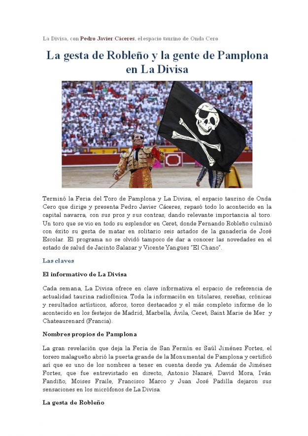 La gesta de Robleño y la gente de Pamplona en La Divisa 2012, HemerotecaPor Claudia Starchevich21 julio, 2012 Informa Producción La Divisa