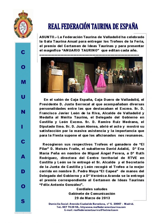 Federación Taurina de Valladolid celebró la Gala Taurina Anual 2013, HemerotecaPor Claudia Starchevich3 abril, 2013 Informa Real Federación Taurina de España