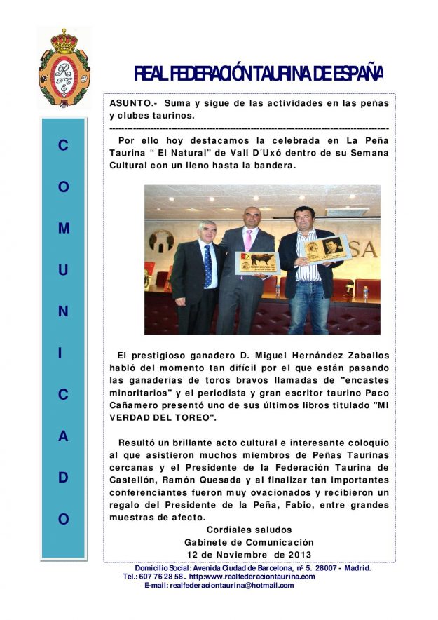 Semana Cultural Peña Taurina El Natural de Vall D´Uxó 2013, HemerotecaPor Claudia Starchevich15 noviembre, 2013 Informa Real Federación Taurina de España