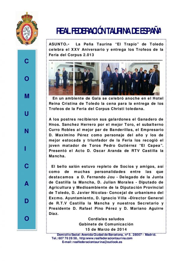 Peña Taurina El Trapío de Toledo celebra el XXV Aniversario y entrega los Trofeos de la Feria del Corpus 2.013 2014, HemerotecaPor Claudia Starchevich18 marzo, 2014 Informa Real Federación Taurina de España