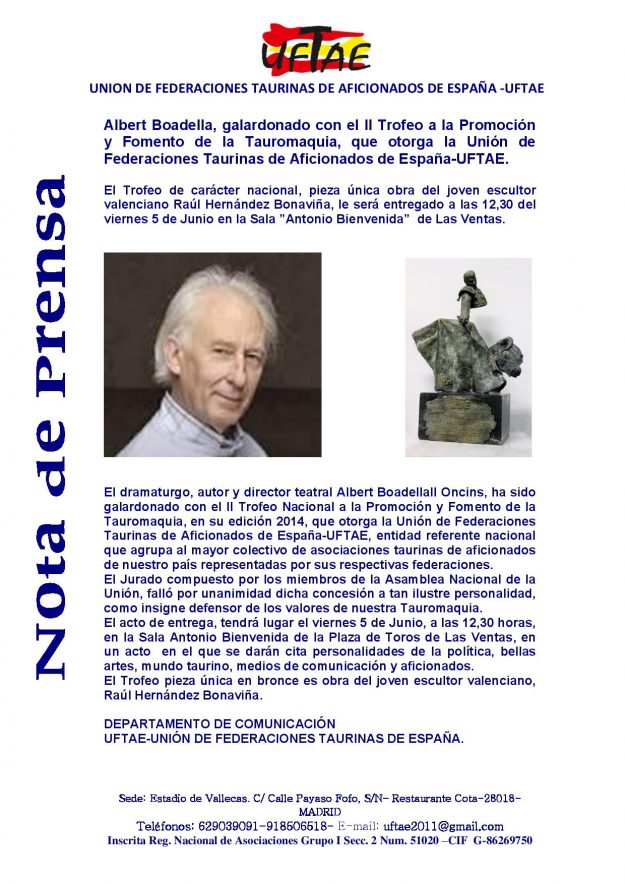Albert Boadella, galardonado con el II Trofeo a la Promoción y Fomento de la Tauromaquia 2015, HemerotecaPor Claudia Starchevich11 mayo, 2015 Informa Federación Taurina de Madrid