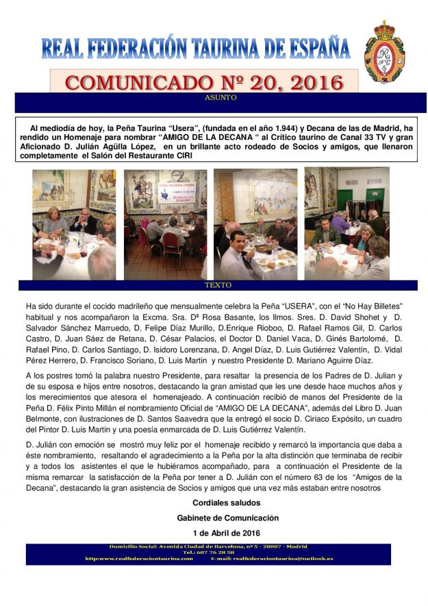 Peña Taurina `Usera´, Decana de las de Madrid, nombró `AMIGO DE LA DECANA´ a Don Julián Agulla López 2016, HemerotecaPor Claudia Starchevich5 abril, 2016 Informa Real Federación Taurina de España