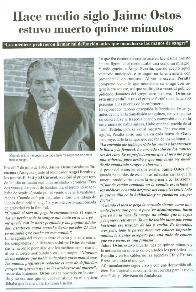 Hace medio siglo Jaime Ostos (Escalera del Éxito 25) estuvo muerto quince minutos 2016, HemerotecaPor Claudia Starchevich11 abril, 2016 Fuente La Mejor Revista de Toros
