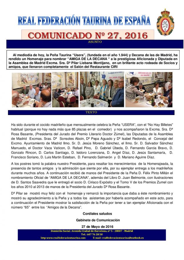 Peña Taurina Usera nombra `Amiga de la Decana´ a la Excma. Sra. Dª Pilar Liébana Montijano 2016, HemerotecaPor Claudia Starchevich1 junio, 2016 Informa Mariano Aguirre. Escalera del Éxito 76
