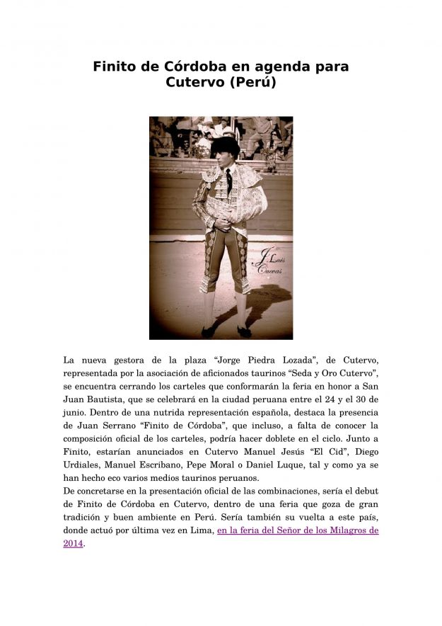 Finito de Córdoba en agenda para Cutervo (Perú) HemerotecaPor Claudia Starchevich3 febrero, 2017Informa: José Luis Cuevas Flores