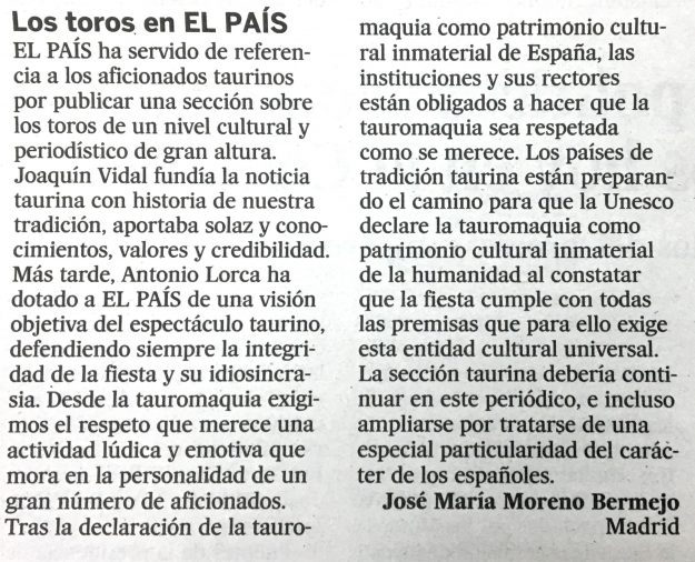 Con motivo de los comentarios oídos sobre la fuerza que ciertos anti taurinos están haciendo para que el diario “El País” suspenda la información taurina, dirigimos hace 4 fechas, al defensor del lector del citado periódico, nuestros argumentos legales, culturales y de necesaria libertad para exigir la continuidad de la citada información. La contestación del…