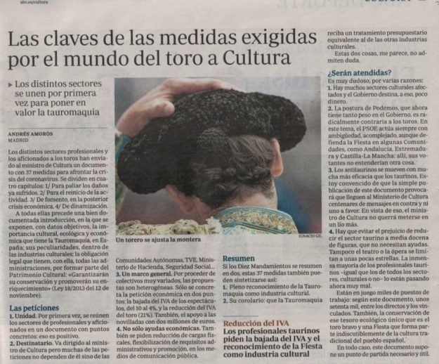 Las claves de las medidas exigidas por el mundo del toro a Cultura – Para + info haz clic👆 🇪🇸 2020, HemerotecaPor Claudia Starchevich7 mayo, 2020Fuente: Diario ABC