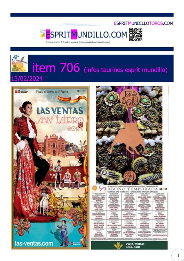 NOUVEAU infos taurines esprit mundillo 706 en ligne / Bimensuel digital taurin gratuit 13/02/2024 – Para + info haz clic👆 🇪🇸 HemerotecaPor Claudia Starchevich28 febrero, 2024 http://www.espritmundillo.com