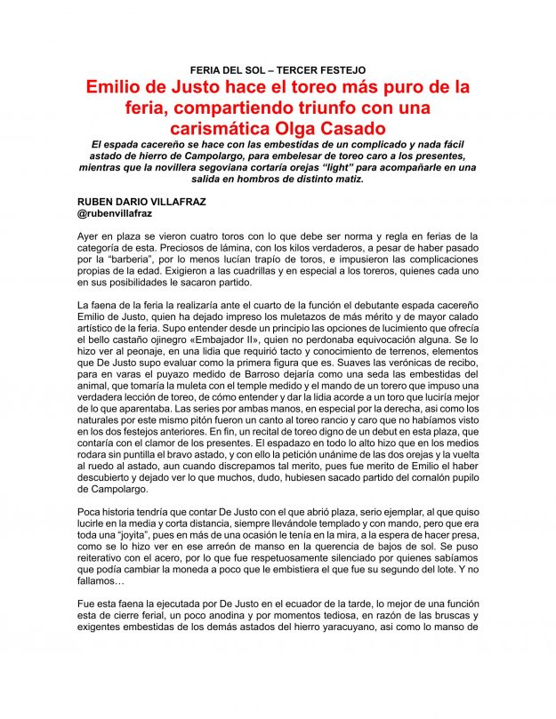 FERIA DEL SOL – TERCER FESTEJO Emilio de Justo hace el toreo más puro de la feria, compartiendo triunfo con una carismática Olga Casado – Para + info haz clic👆 🇪🇸 HemerotecaPor Claudia Starchevich22 febrero, 2026