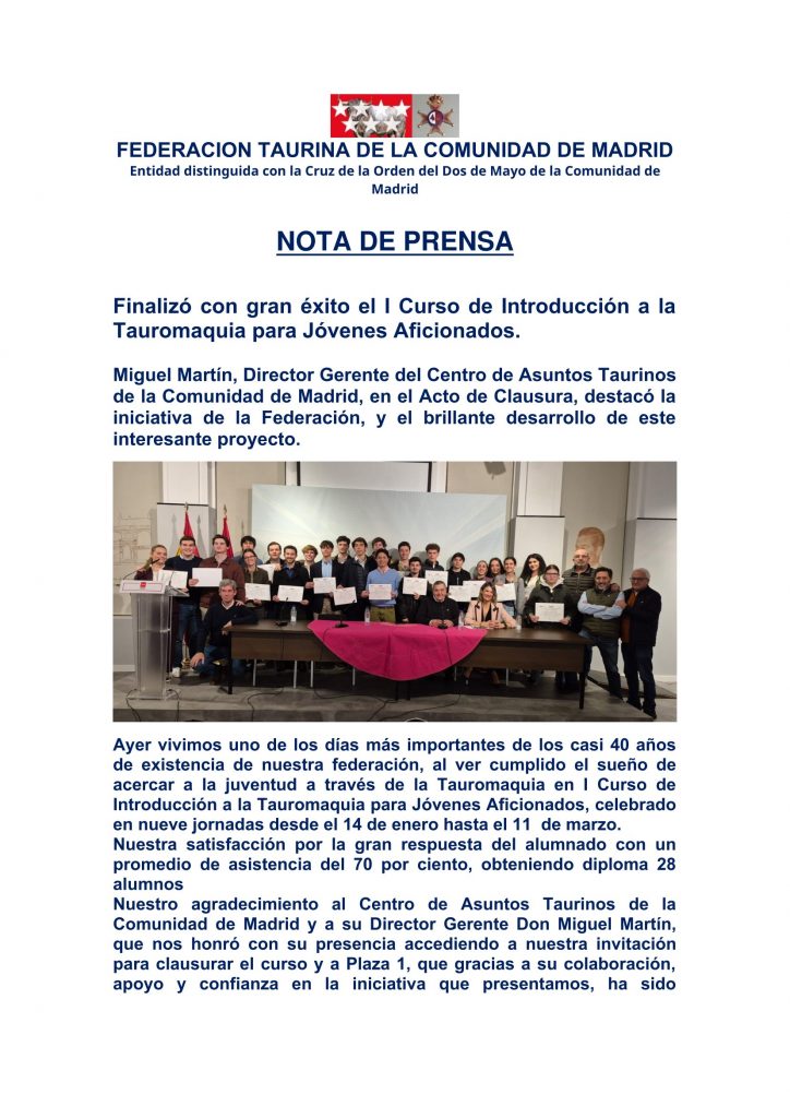 CLAUSURA I CURSO DE INTRODUCCIÓN A LA TAUROMAQUIA PARA JÓVENES AFICIONADOS – Para + info haz clic👆 🇪🇸 HemerotecaPor Claudia Starchevich17 marzo, 2026