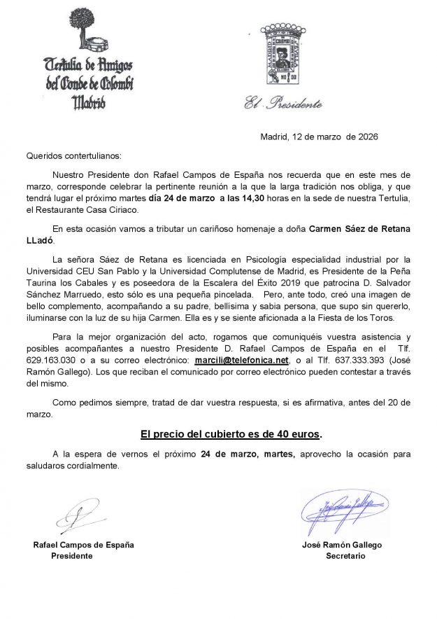 Peña Taurina «Tertulia de Amigos del Conde de Colombí» rendirá homenaje a Doña Carmen Sáez de Retana y Lladó – Escalera del Éxito nº 238 el próximo 24 de marzo – Para + info haz clic👆 🇪🇸