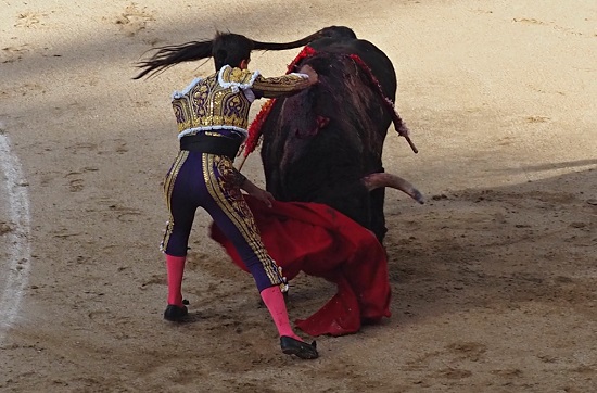 ROMUALDO ALMODOVAR, colocado junto a la raya, deja que se estrelle el burel en el peto dándole un puyazo caído. El 2º es trasero, y no aprieta, midiendo el castigo. Evaluación: 4.