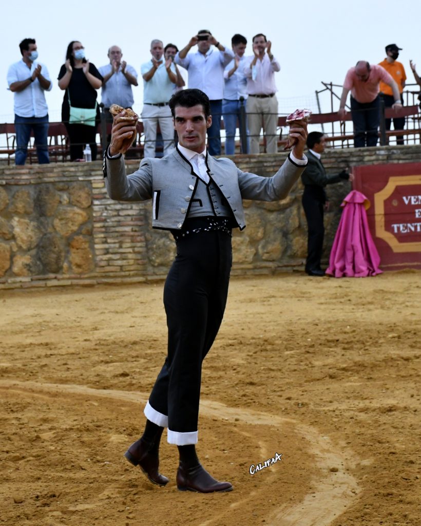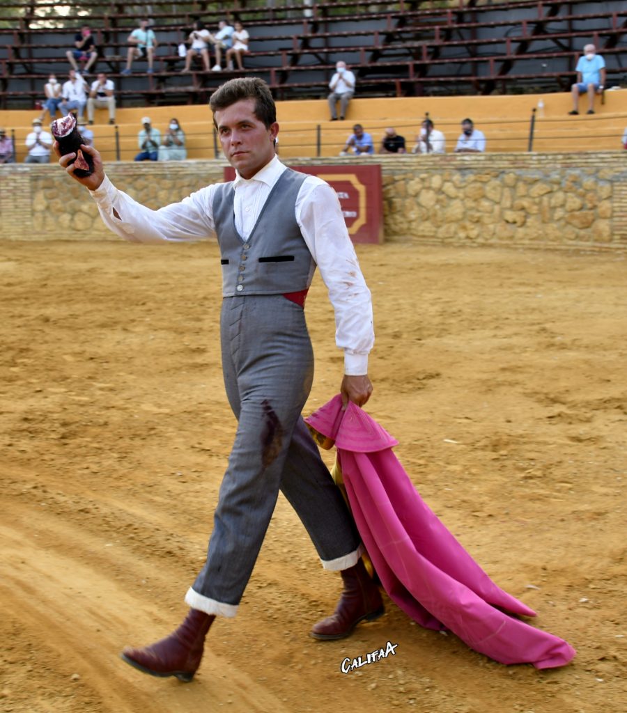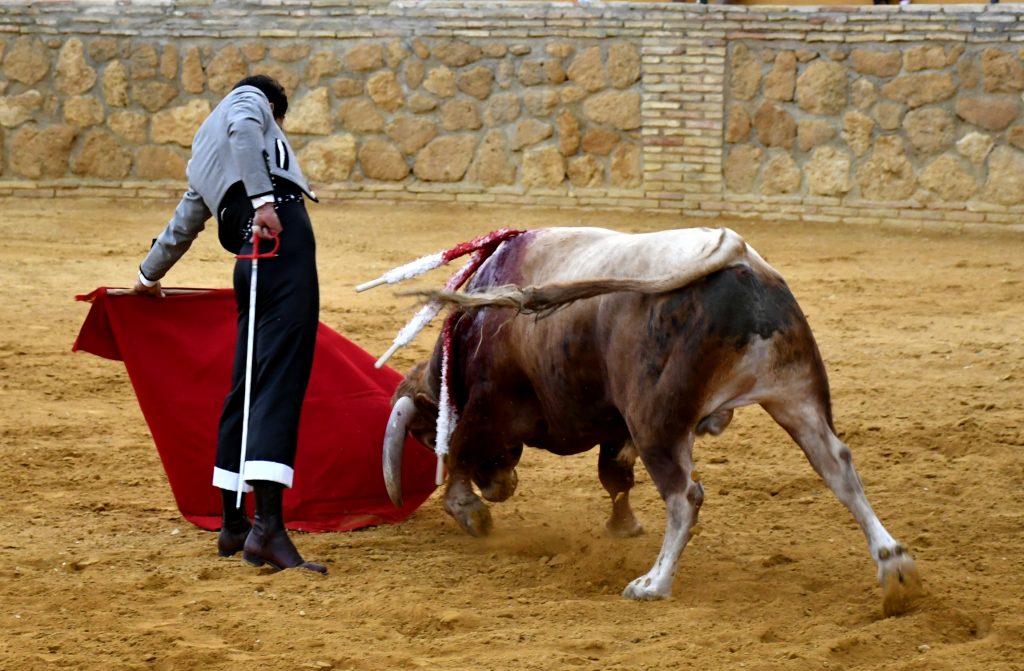 Abrió plaza el novillero de SANLUCAR DE BARRAMEDA ELOY HILARIO le toco en suerte un novillo negro que fue el de embestidas mas incierta sobre todo por el lado derecho. Cubrió el tercio de banderillas exponiendo mucho en el primer par para arrancar la primera ovación de la tarde, con la muleta le planto cara el novillero que fue todo ganas y corazón, hacentando su faena por el pitón izquierdo que fue el lado mas potable del novillo, naturales y pases del desprecio que pusieron a sonar el pasodoble, por el pitón derecho logro instrumentar tandas de mucho merito, con el publico entregado.