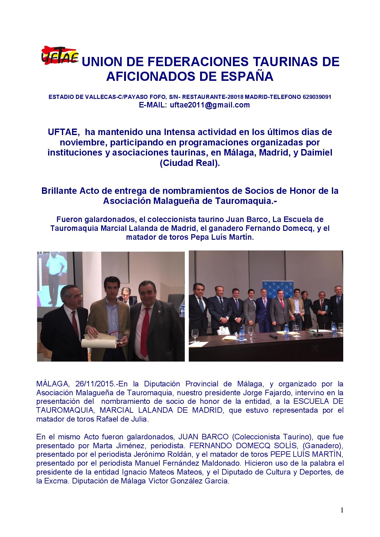Acto de entrega de nombramientos de Socios de Honor de la Asociación Malagueña de Tauromaquia