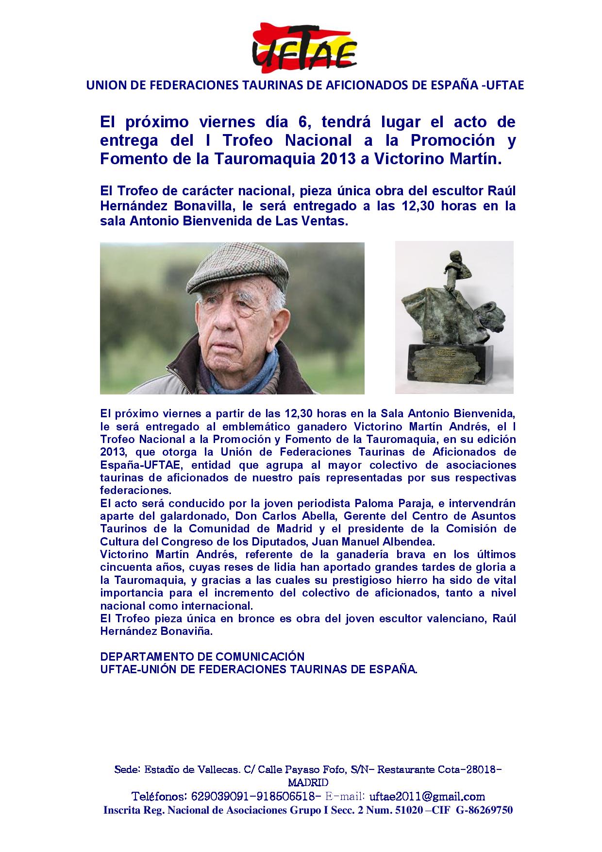 Acto de entrega I Trofeo Nacional a la Promoción y Fomento de la Tauromaquia a Victorino Martín – Escalera del Éxito nº 11