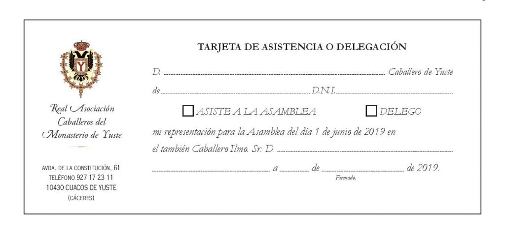 Adjuntamos la tarjeta de delegación, que será acompañada de una fotocopia del D.N.I. de cada Caballero. No tendrá validez ninguna representación que no haya sido enviada con la antelación suficiente, siete días antes de la celebración de la Asamblea, a la oficina administrativa de esta Real Asociación Caballeros del Monasterio de Yuste.