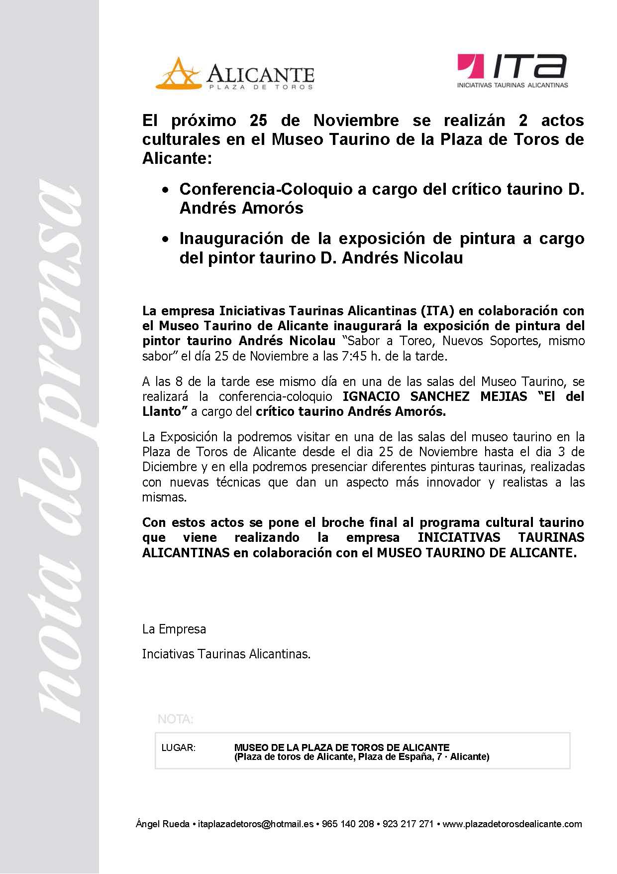 Actos culturales día 25 en el Museo Taurino de la plaza de toros de Alicante
