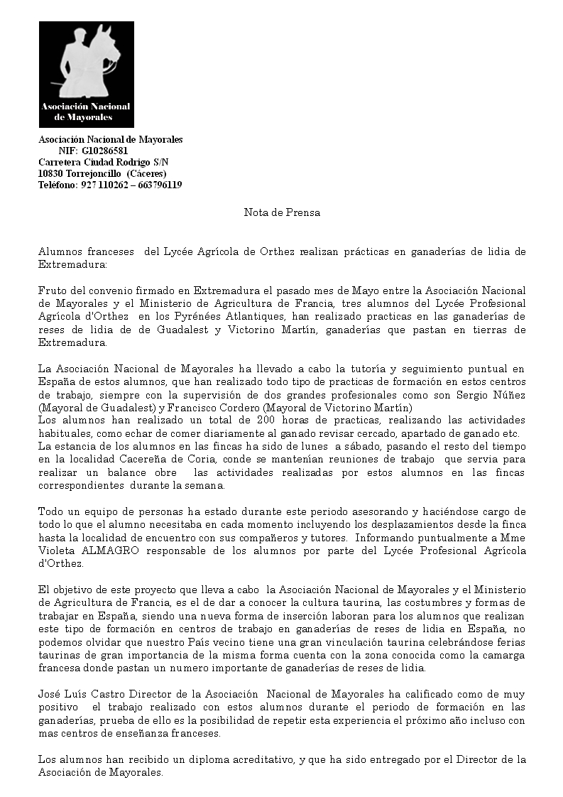 Alumnos franceses del Lycée Agrícola de Orthez realizan prácticas en ganaderías de lidia de Extremadura
