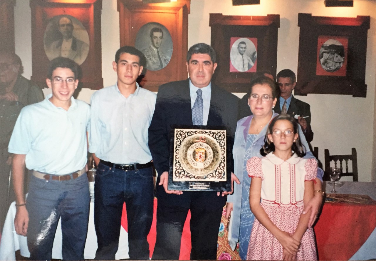Posando con su familia tras recibir el 8º Premio periodístico y literario «Pepe Guerra Montilla» del Círculo Taurino de Córdoba. Año 2001.