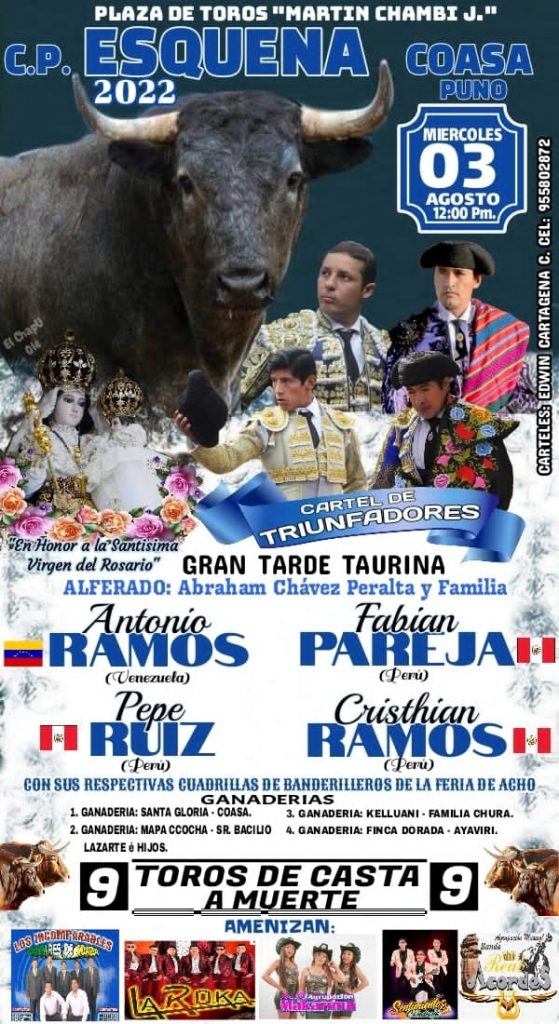 Del mismo modo, Ramos aparece anunciado para presentarse de luces en la gran tarde taurina que se llevará a efecto en la plaza de toros «Martín Chambi J.» en Coasa Puno, el día miércoles 3 de agosto, en la feria en Honor a la Santísima Virgen de El Rosario que año a año se celebra en esa jurisdicción incaica.