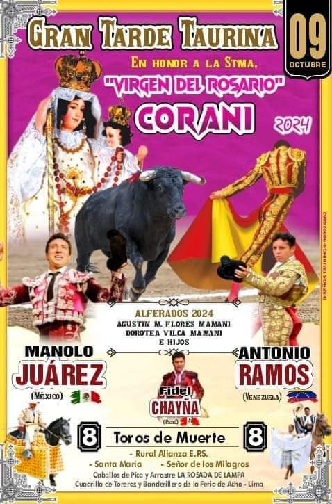 En esa tarde taurina que se celebra en honor al Señor de Los Milagros, los espadas integrantes de este cartel internacional de Ranrahirca, lidiarán nuevamente reses de la importante ganadería peruana Chuquizongo, que, de acoplarse y embestir, seguramente se verán pasear las orejas en el redondel por los toreros actuantes.
