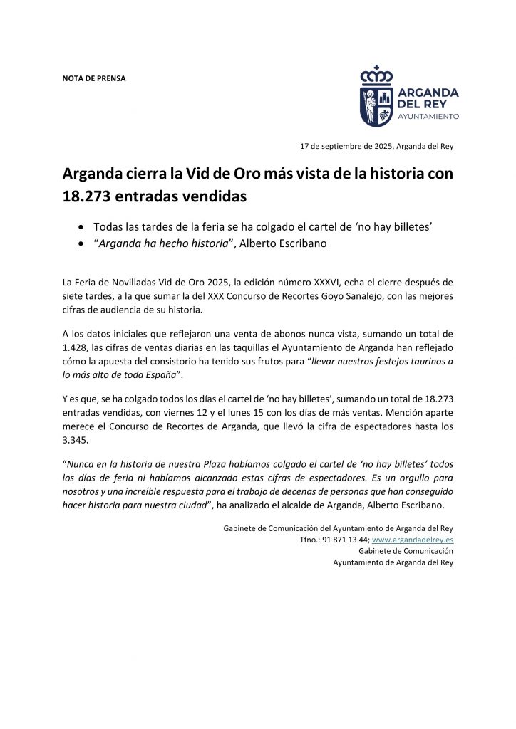 Arganda cierra la Vid de Oro más vista de la historia con 18.273 entradas vendidas – Para + info haz clic👆 🇪🇸