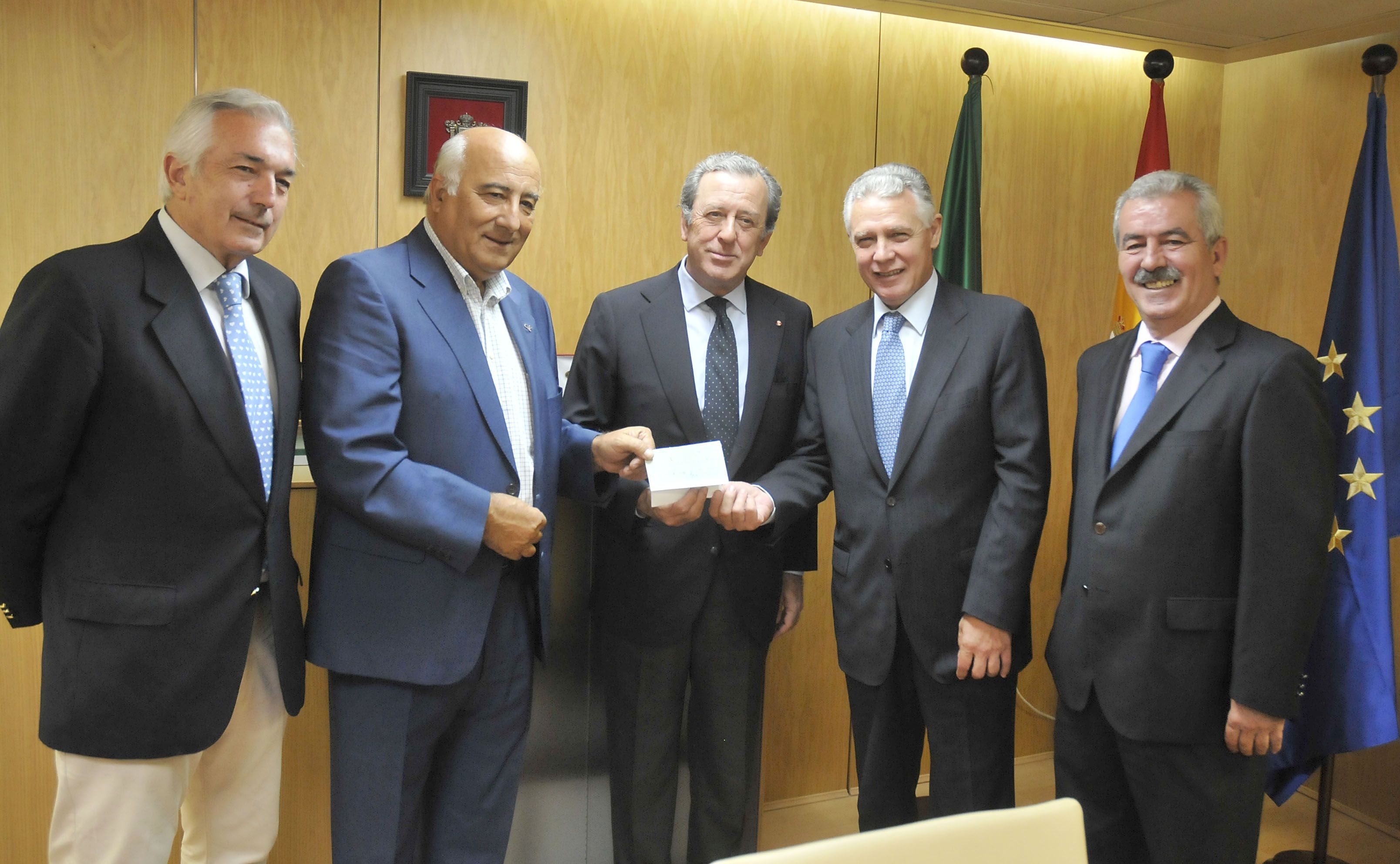 D. Miguel Serrano, Vicepresidente de la A.A.E. T. Pedro Romero, D. Eduardo Ordóñez, Presidente de la A.A. E.T. Pedro Romero, D. Javier Benjumea, Teniente hermano mayor de la Real Maestranza de Caballería, D. Francisco Menacho, Consejero de Gobernación y Justicia y D. Luis Partida, Director General de Juegos y Espectáculos de la Junta de Andalucía.