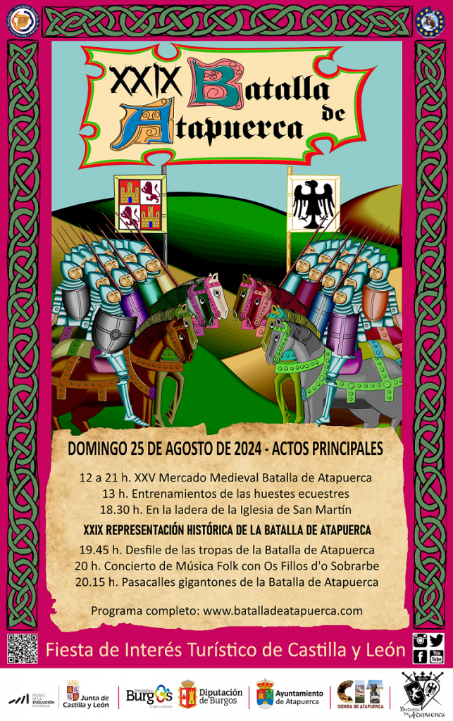 Pero, además de la recreación que, naturalmente, es el acto central de la fiesta, Atapuerca retrocede casi diez siglos y muestra un mercado medieval, instalado en la plaza del pueblo, de 12,00 a 21,00 horas, donde el visitante puede encontrar viandas, artesanía y complementos variados, los entrenamientos ecuestres, los talleres educativos de cestería, cerámica y lucha del palo, exposiciones de tintes y telares, el desfile de los ejércitos, el baile de los gigantones, los protagonistas de la Batalla y personajes principales de la representación histórica –el rey de León y conde de Castilla Fernando I, el rey de Pamplona-Nájera García III, el caballero Sancho Fortún “el traidor”, y Velasquita, esposa de Sancho Fortún y amante del rey navarro–, y un concierto de Os fillos d´o Sobrarbe, música folk medieval con gaitas y percusión, completan la jornada del domingo, aunque las actividades complementarias se extienden a lo largo de varios días.