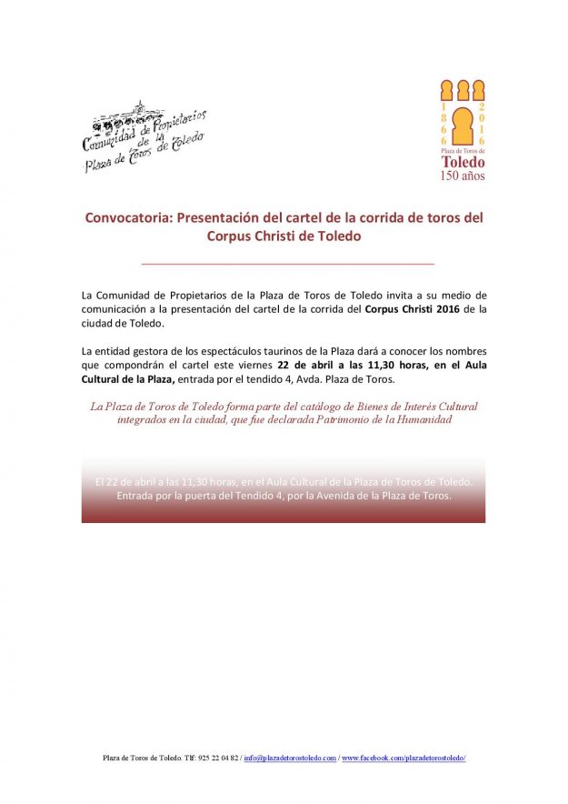 Presentación del cartel para la corrida del Corpus Christi de Toledo 2016, HemerotecaPor Claudia Starchevich21 abril, 2016 Informa Comunidad de Propietario de la Plaza de Toros de Toledo