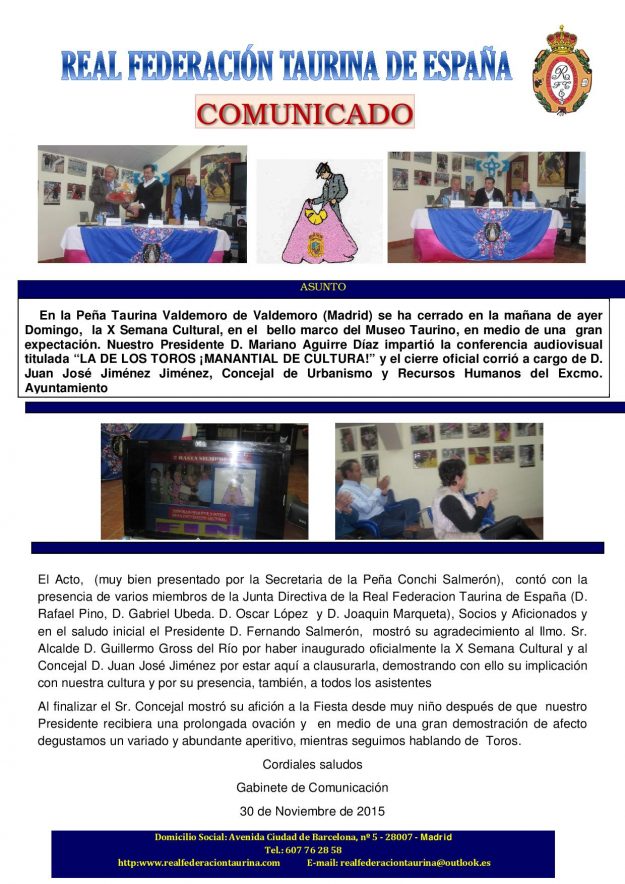 X Semana Cultural en la Peña Taurina Valdemoro 2015, HemerotecaPor Claudia Starchevich3 diciembre, 2015 Informa Real Federación Taurina de España