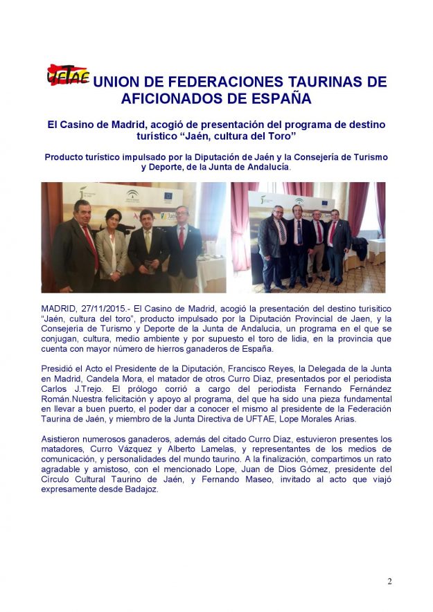 Casino de Madrid acogió la presentación del destino turísitico `Jaén, cultura del toro´ 2015, HemerotecaPor Claudia Starchevich4 diciembre, 2015 Informa UFTAE