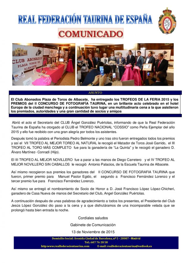 Entregados los Trofeos del Club Abonados Plaza de Toros de Albacete 2015, HemerotecaPor Claudia Starchevich18 noviembre, 2015 Informa Real Federación Taurina de España