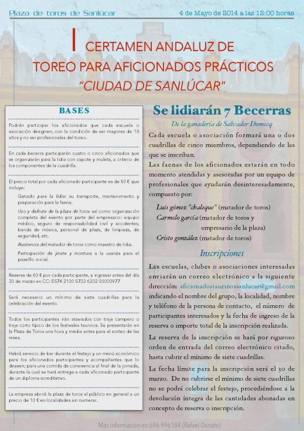 I Certamen Andaluz de Toreo para Aficionados Prácticos Ciudad de Sanlúcar 2014, HemerotecaPor Claudia Starchevich18 marzo, 2014 Informa Federación Taurina de Madrid