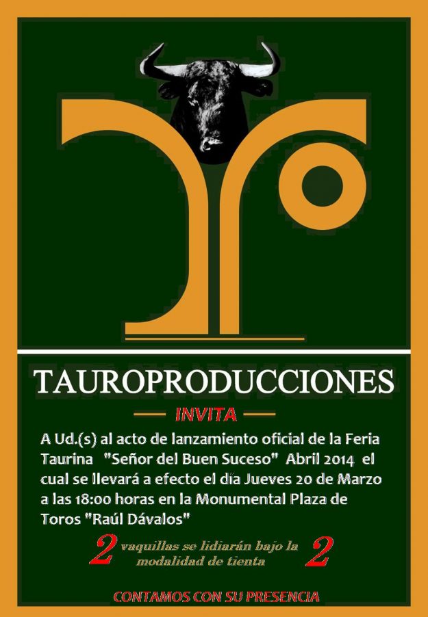 Lanzamiento oficial Feria Taurina Señor del Buen Suceso 2014 2014, HemerotecaPor Claudia Starchevich19 marzo, 2014 Informa desde Ecuador. Enrique Cobo