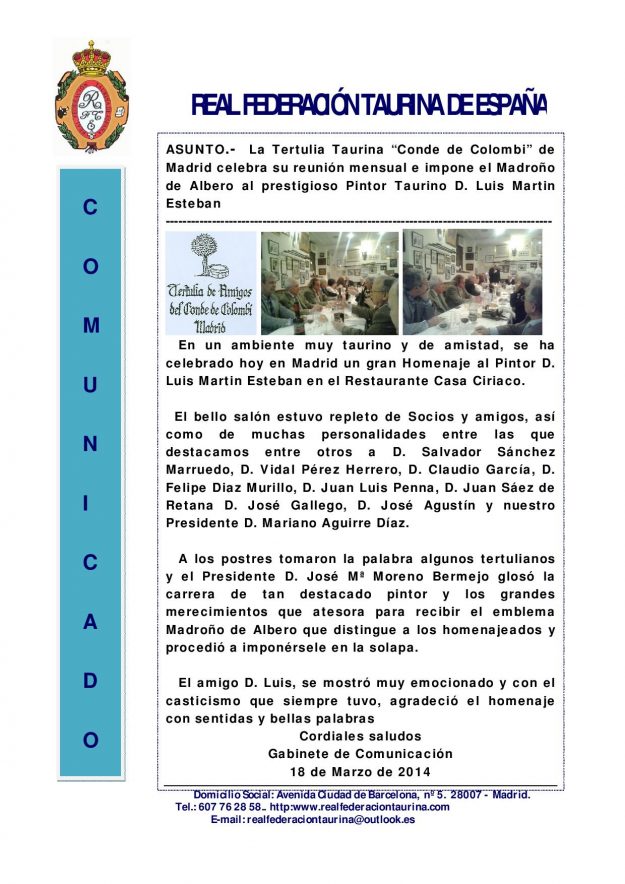 La Tertulia Taurina Conde de Colombi impone Madroño de Albero al prestigioso Pintor Taurino D. Luis Martin Esteban 2014, HemerotecaPor Claudia Starchevich19 marzo, 2014 Informa Real Federación Taurina de España
