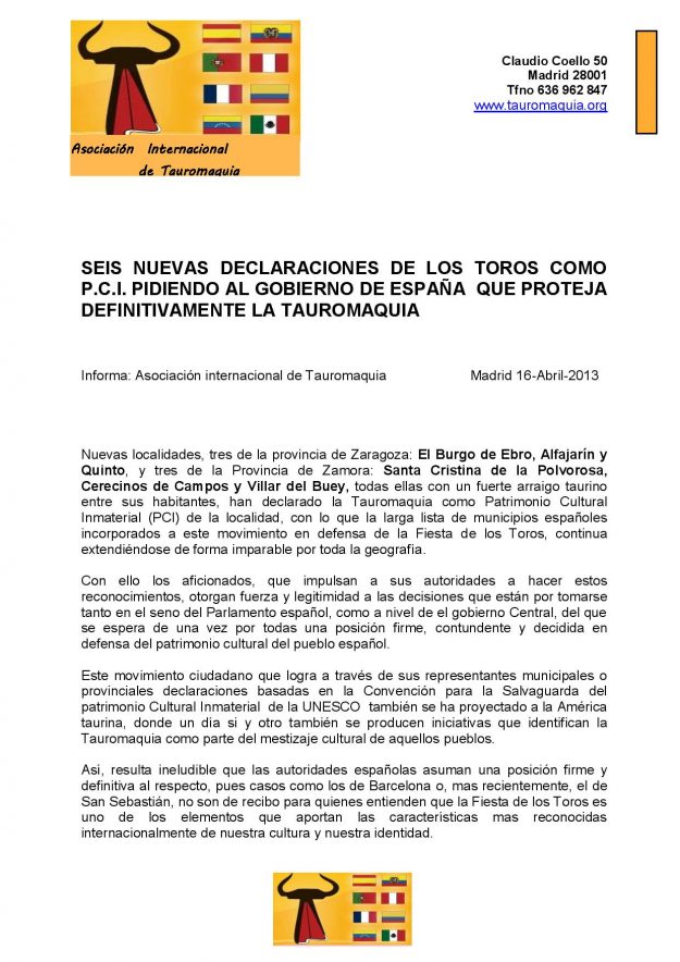 Seis localidades españolas piden declaren sus festejos taurinos Patrimonio Cultural Inmaterial 2013, HemerotecaPor Claudia Starchevich24 abril, 2013 Informa Asociación Internacional de Tauromaquia