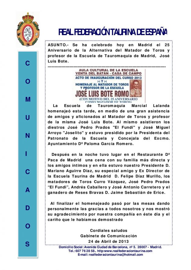 Homenaje al matador de toros José Luis Bote Romo en su 25 aniversario de alternativa en la Escuela Marcial Lalanda 2013, HemerotecaPor Claudia Starchevich25 abril, 2013 Informa Real Federación Taurina de España