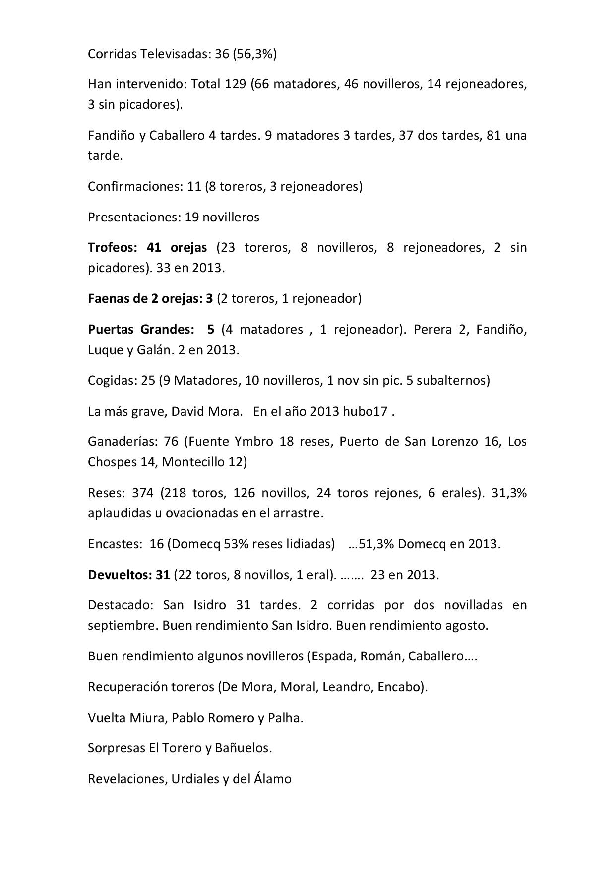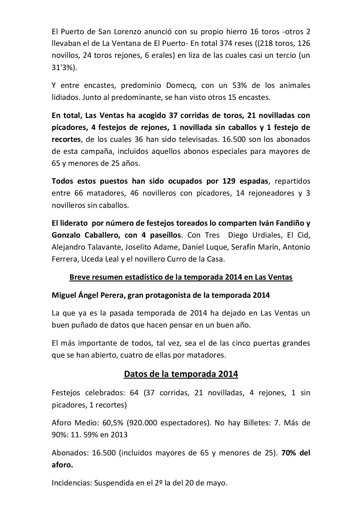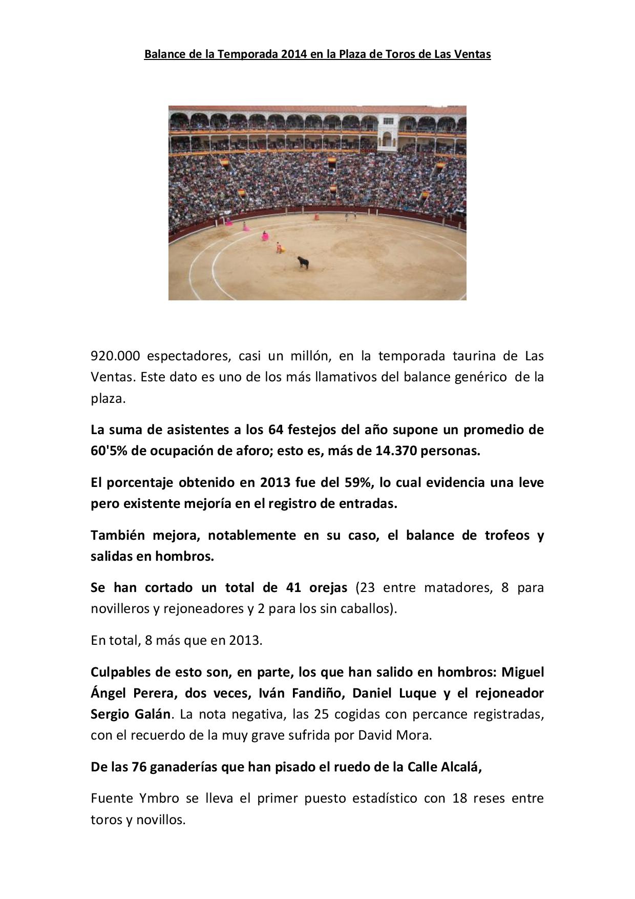 Balance de la Temporada 2014 en la Plaza de Toros de Las Ventas