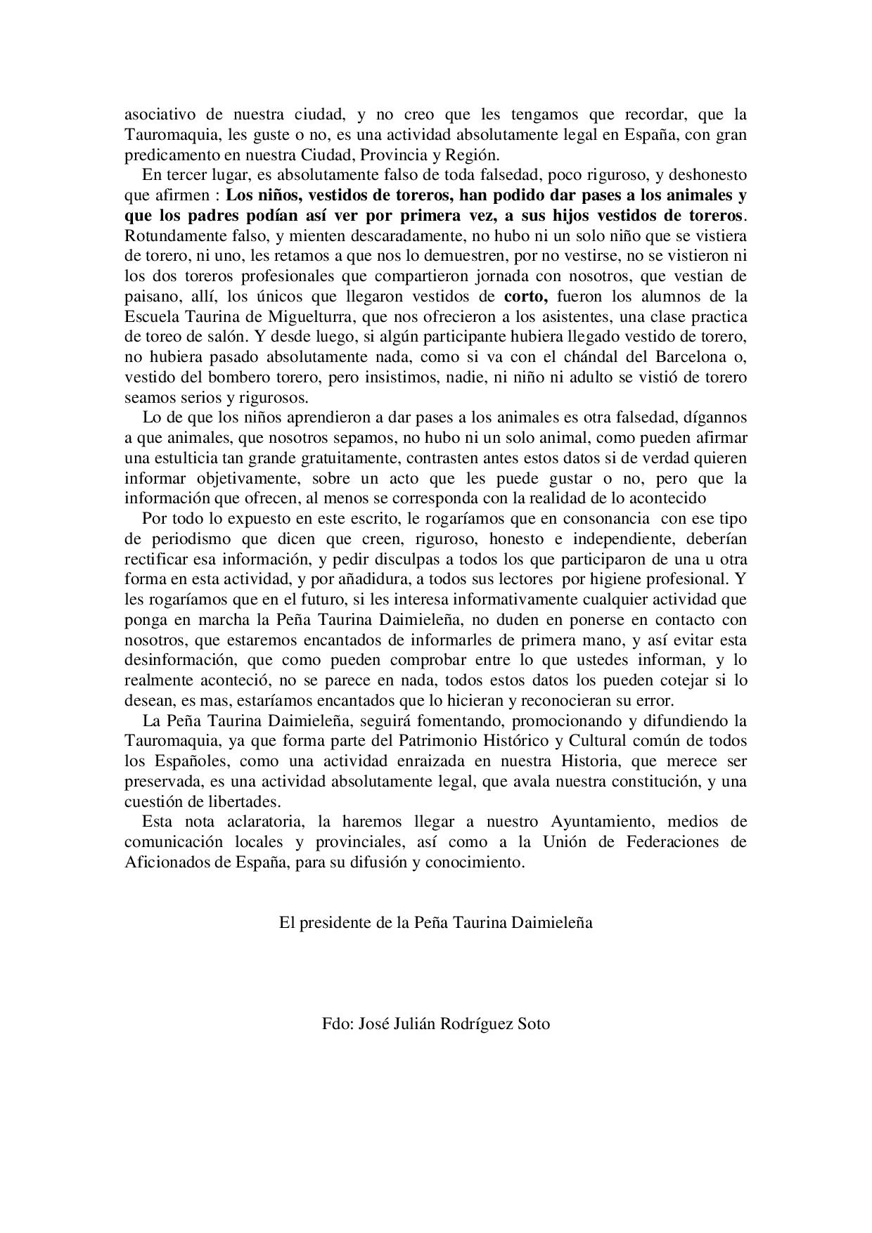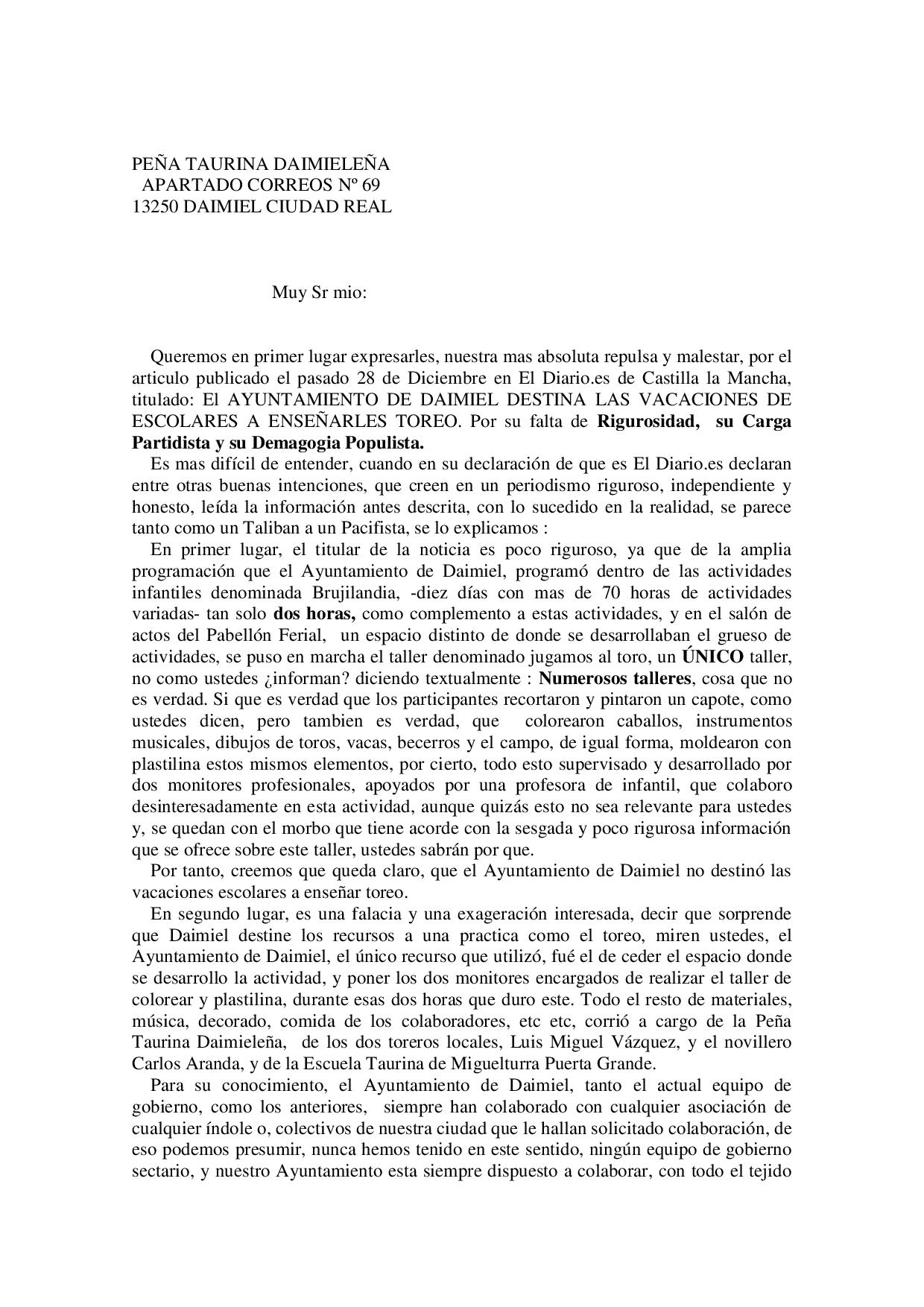 Carta emitida por la prestigiosa entidad Peña Taurina Daimieleña a eldiario.es de Castilla la Mancha