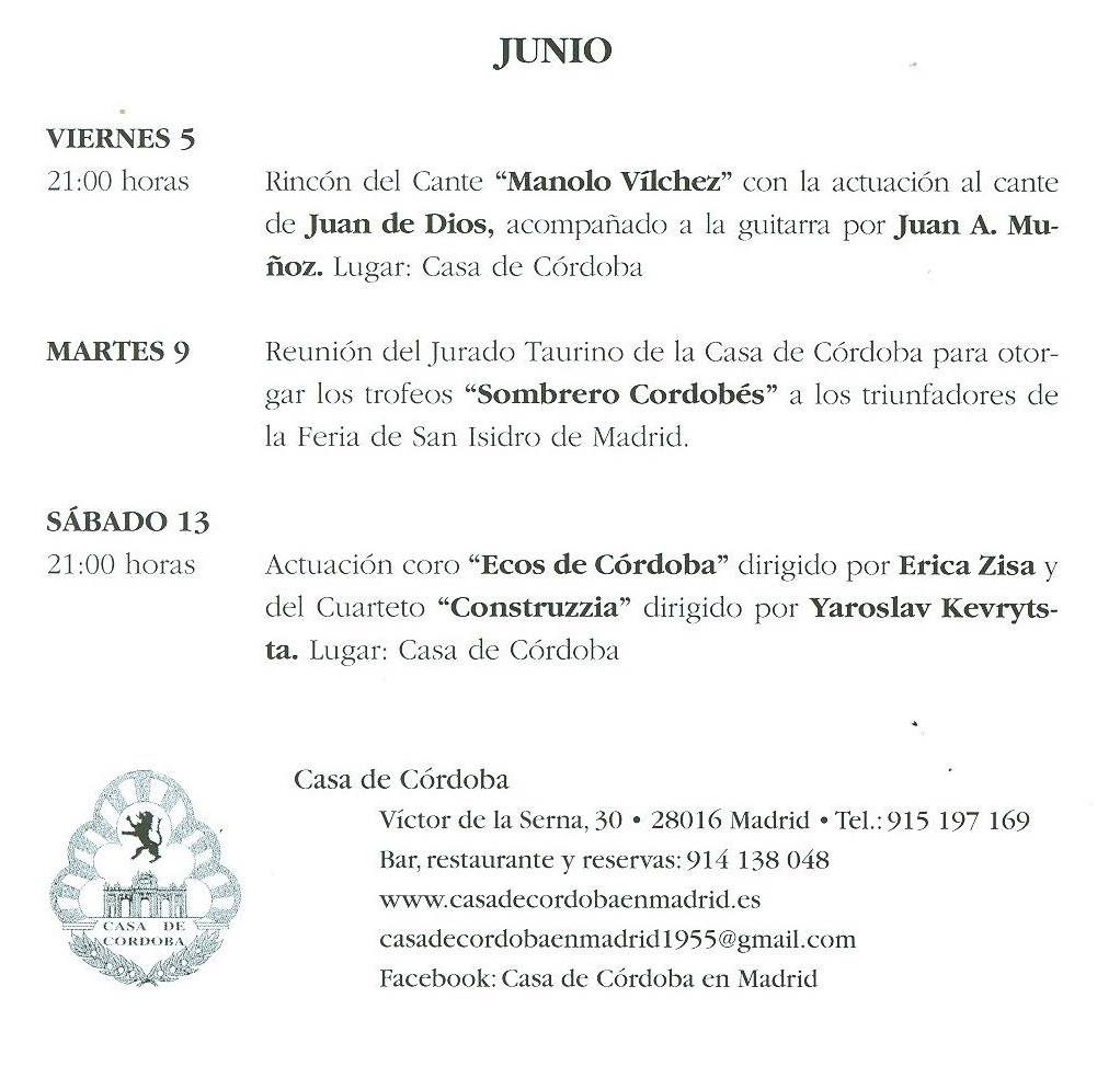 Casa de Córdoba en Madrid. Programa de Actos mes de junio 2015