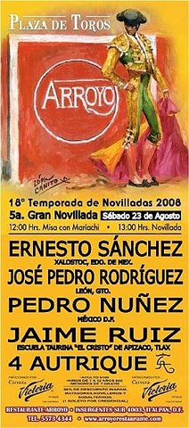Quedó listo el cartel para la que será la quinta novillada de la temporada en la placita de toros de Tlalpan, la Antonio Velázquez de los señores Arroyo, donde se celebra la 18ª Temporada de Novilladas 2008. Este próximo sábado 23 de agosto a la 13 hrs., partirán plaza los novilleros Ernesto Sánchez de Xalostoc, Estado de México, repite José Pedro Rodríguez de León, Guanajuato por su buena actuación que tuvo ya en este ruedo recientemente. Se presenta Pedro Núñez, del D. F., que aún y cuando ya salió de sobresaliente en la primera novillada, esta será su presentación en esta temporada y se presenta Jaime Ruiz de la escuela taurina El Cristo de Apizaco, Tlaxcala. (Informa José Ricardo Gómez Cardona Canta Claro)