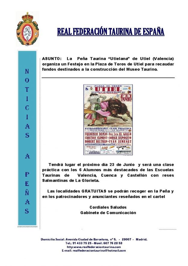 Festejo en la Plaza de Toros de Utiel 2012, HemerotecaPor Claudia Starchevich22 junio, 2012 Informa Real Federación Taurina de España