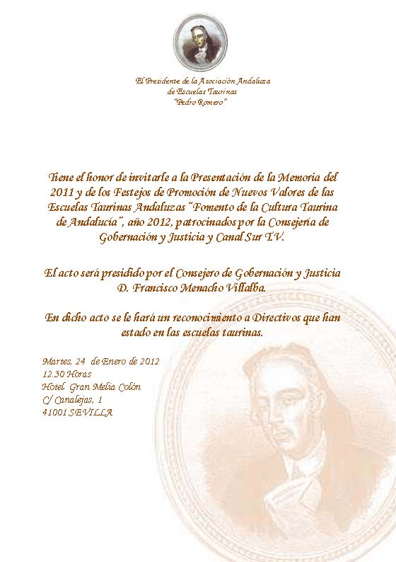 Acto de presentación del calendario 2012 y memoria 2011 de la Escuela Taurinas «Pedro Romero» 2012, HemerotecaPor Claudia Starchevich23 enero, 2012 Informa Eduardo Ordoñez