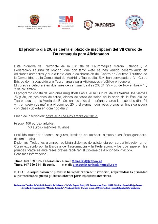 VII Curso de Tauromaquia para Aficionados 2012, HemerotecaPor Claudia Starchevich18 noviembre, 2012 Informa Federación Taurina de Madrid