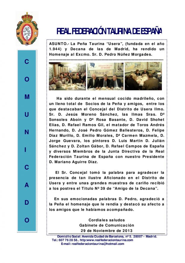 La Peña Taurina Usera, Decana de las de Madrid, ha rendido un Homenaje a Pedro Núñez Morgades – Escalera del Éxito 97 2013, HemerotecaPor Claudia Starchevich11 diciembre, 2013 Informa Real Federación Taurina de España