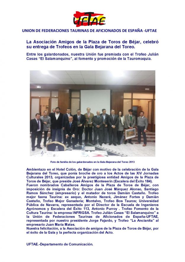 Entrega de Trofeos de la Asociación Amigos de la Plaza de Toros de Béjar 2013, HemerotecaPor Claudia Starchevich10 diciembre, 2013 Informa UFTAE