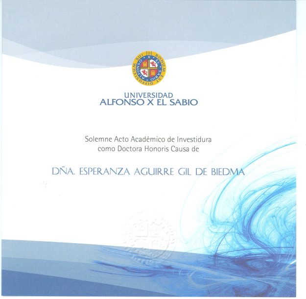 Doña Esperanza Aguirre será nombrada Doctora Honoris Causa por la Universidad Alfonso X El Sabio 2013, HemerotecaPor Claudia Starchevich10 abril, 2013 Informa Redacción Sabios del Toreo