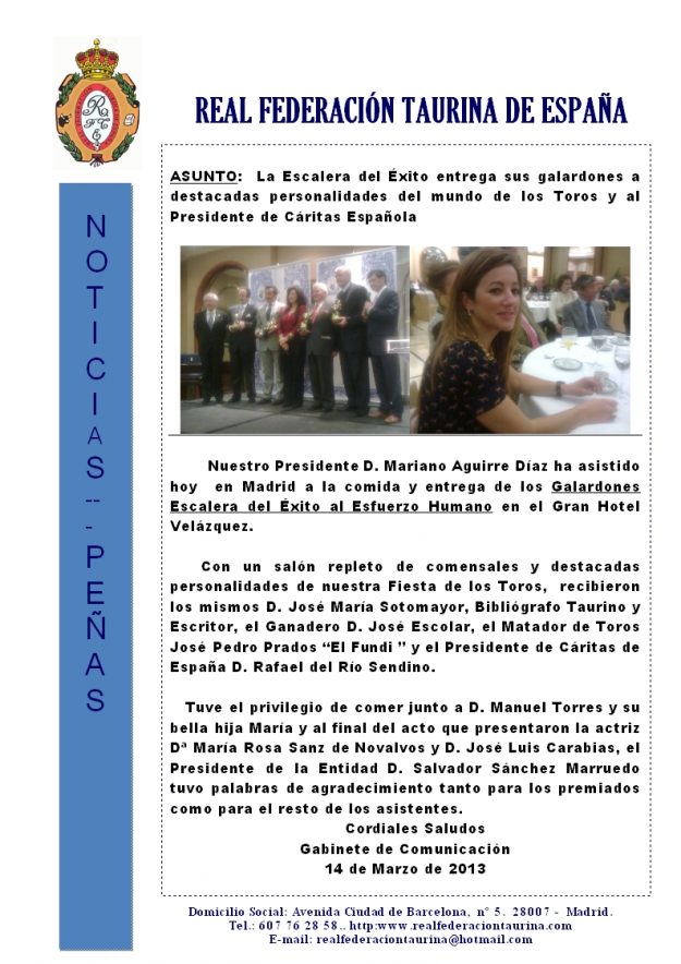 Escalera del Éxito hizo entrega de sus galardones 2013, HemerotecaPor Claudia Starchevich23 marzo, 2013 Informa Real Federación Taurina de España