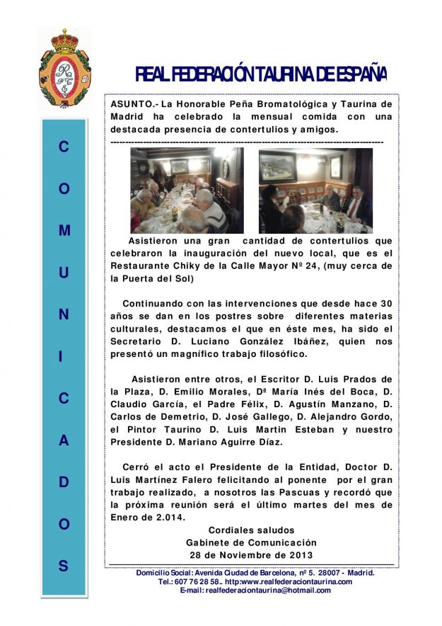 La Honorable Peña Bromatológica y Taurina de Madrid ha celebrado la mensual comida con una destacada presencia de contertulios y amigos 2013, HemerotecaPor Claudia Starchevich9 diciembre, 2013 Informa Real Federación Taurina de España
